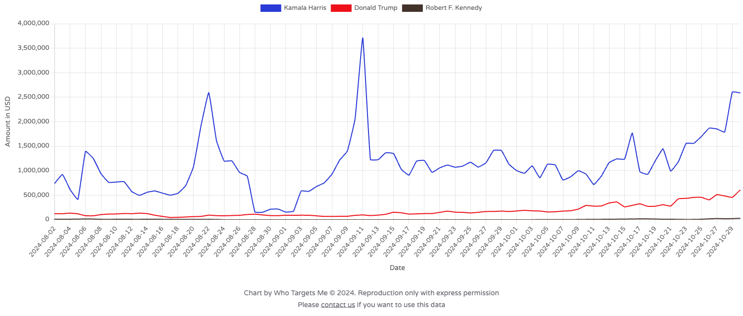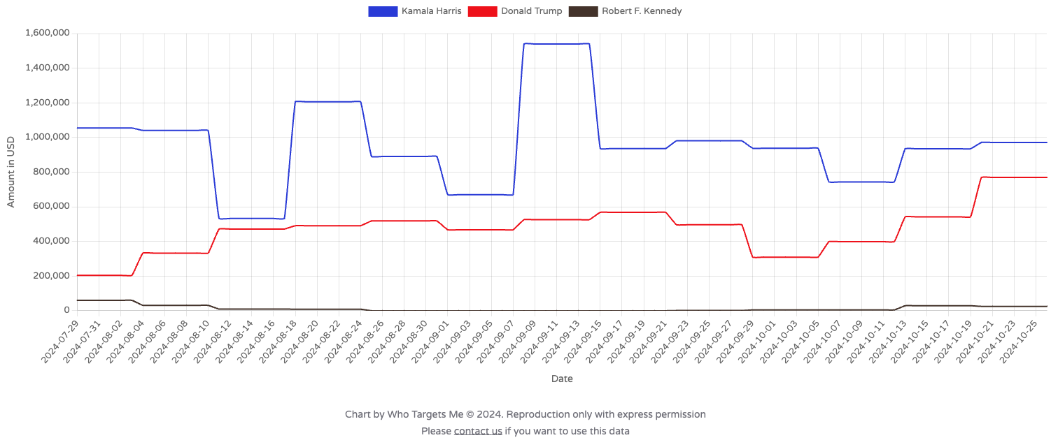 Daily political ad buys for the rival presidential campaigns on Meta's platforms from Aug 2 to Oct 29, the latest figures available.