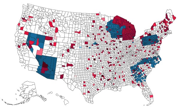 Social media ad buys across Facebook's platforms between Oct 23 and Oct 30, the latest figures available. The darker the red/blue, the more money spent in those parts of the states.