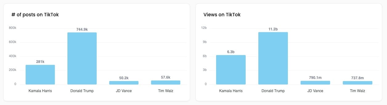 Overall number of posts and views on TikTok, related to Harris, Trump, JD Vance and Tim Walz, over the last 60 days, the latest figures available.