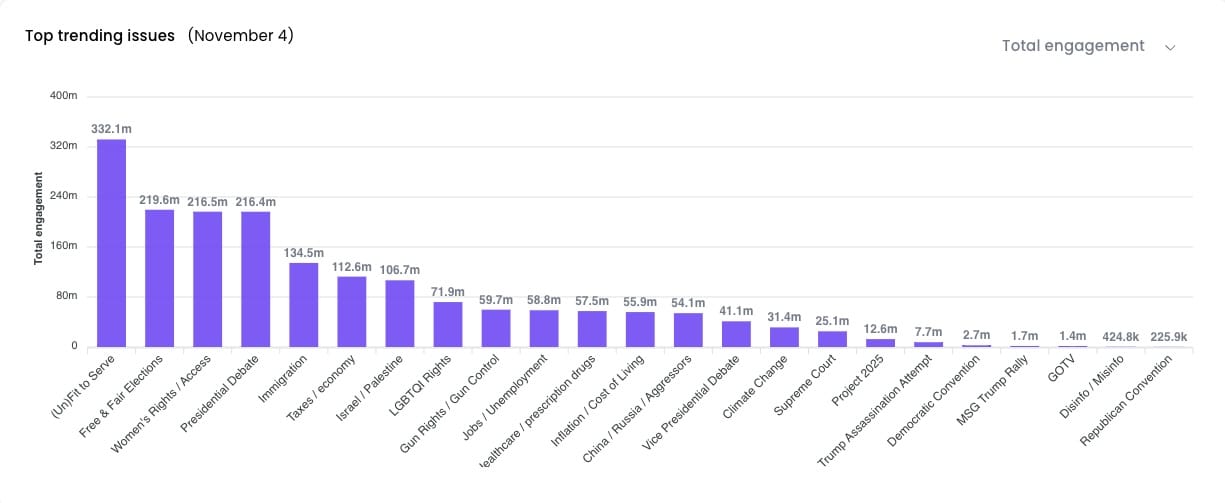 Below, for instance, are the top trending political topics on TikTok for Nov 4, the latest figures available. Some — like women's rights and immigration — are likely themes that either candidate would like to see going viral. But others — (un)fit to serve and Israel/Palestine — are user-led trends that both Trump and Harris have no control over, but still are being shared/viewed by millions of TikTokers.