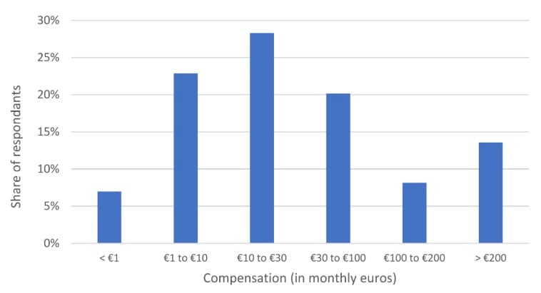 Roughly one-third of the respondents said they wouldn't sell their data at any price. But among the other two-thirds of individuals, the sweet spot fell somewhere between €10-€30, or $12-$35, a month.
