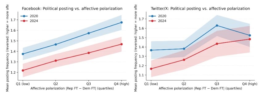 The second set of charts (on the right) shows the level of posting on both X and Facebook rose significantly, over that period, for those users who were more polarized than their more mainstream counterparts.