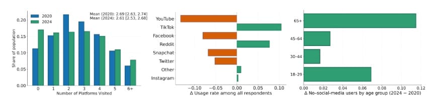 The first set of charts (on the left) highlight how between the 2020-2024 election cycles, all social media sites — with the exception of TikTok and Reddit — lost users, particularly among the young and elderly.