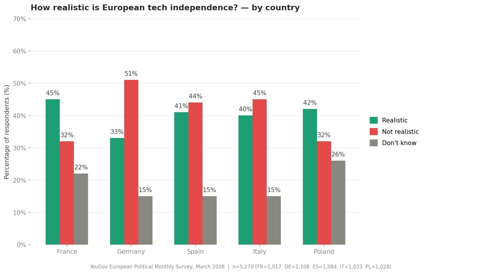 Again, the country-by-country differences (see chart below) were illustrative. In Germany, Europe's largest economy, skepticism about replacing US tech ran at 51 percent. In France and Poland, that figure fell to 32 percent, respectively, while over 40 percent of respondents in each country said it would be realistic to shift from American providers to those from the bloc.